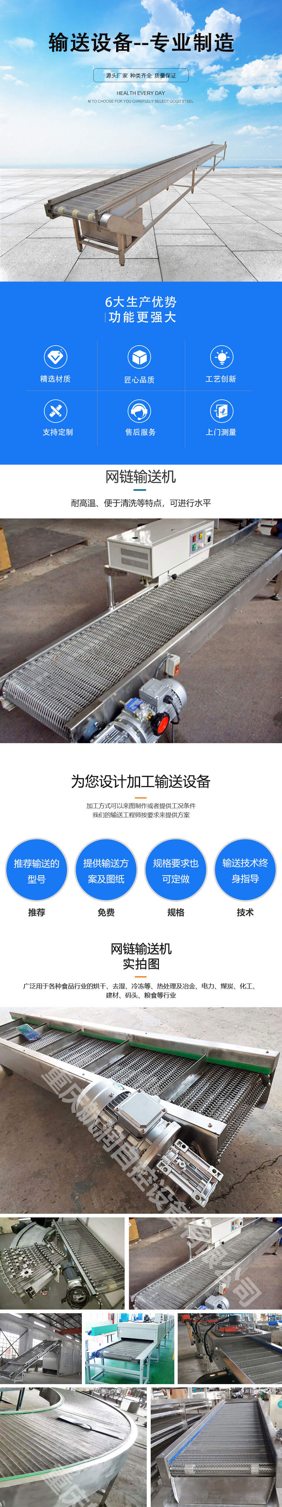 網(wǎng)鏈輸送機采用不鏽鋼網帶作為載體,具(jù)有(yǒu)耐高溫、便於清洗等特點,可(kě)進行水平、傾斜和垂(chuí)直輸送,也(yě)可組(zǔ)成空間輸(shū)送線(xiàn)路,輸送能力大,運行可靠、工(gōng)藝布置靈活、還可在輸送過程中同時完成若(ruò)幹(gàn)工藝操作; 廣泛用(yòng)於各種食品行業的(de)烘幹、去濕、冷凍等、熱處理及冶金、電力、煤炭、化工、建材、碼頭、糧食等行業。